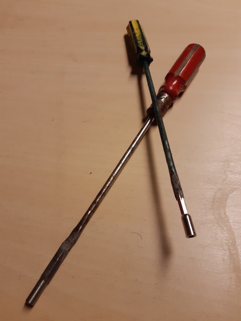 Soit braser ou souder à froid un embout, par exemple à tête de forme ovale, sur un tournevis plat dont on conserve toute la longueur utile.